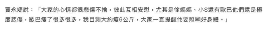 此外,贾永婕还提到了大S家属的情况,她说S妈、小S、具俊晔极度悲伤,她还目测具俊晔瘦了12斤,大家都提醒他要注意身体。