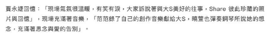 贾永婕说现场氛围很温暖,有笑有泪,大家诉说着与大S有关的美好往事。
