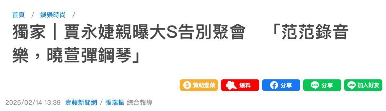 贾永婕还说范玮琪将自己创作的音乐放给大S听,范晓萱则为大S弹奏钢琴。