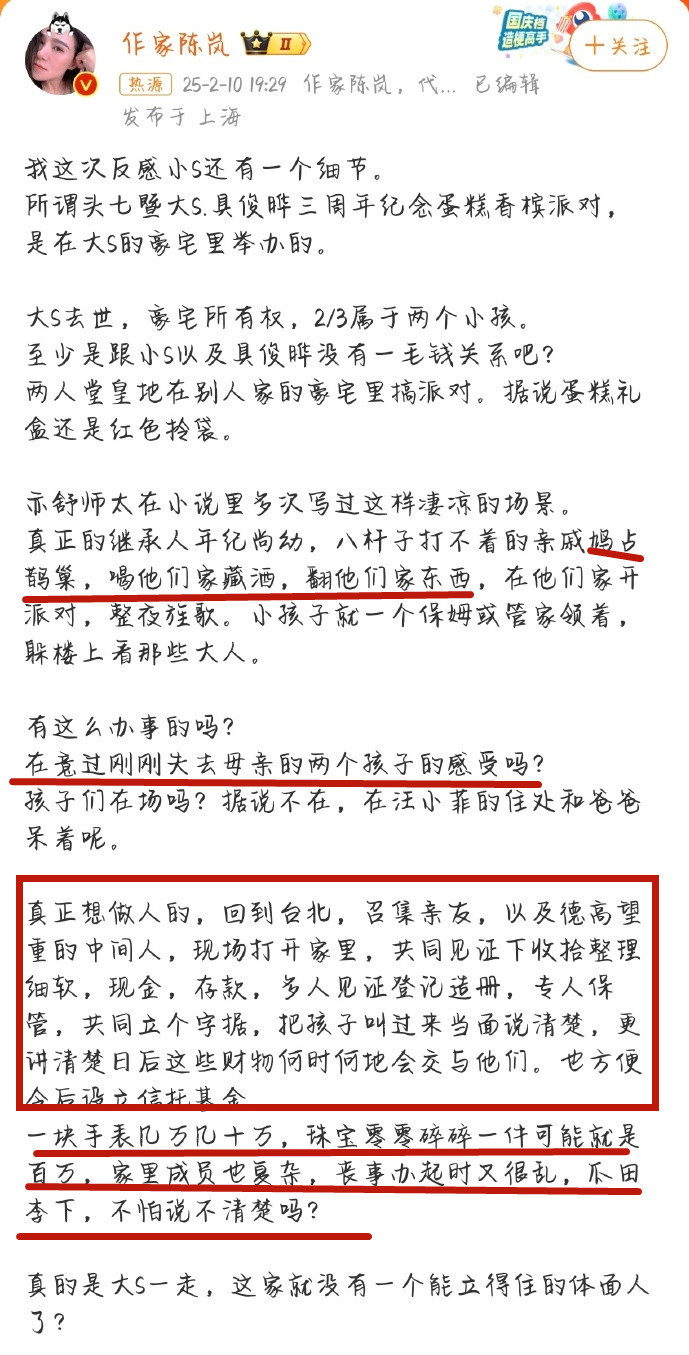 在大S家的第一场追思会结束后,作家陈岚就发文怒批小S。